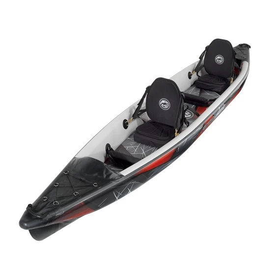 Das Boot wurde im Drop-Stitch Verfahren gefertigt, welches es ermöglicht, das Kajak mit einem höheren Betriebsdruck (bis zu 10 PSI) aufzupumpen. Es liegt dadurch viel fester und kippstabiler auf dem Wasser und bietet einen schnelleren Geradeauslauf. Einfach mal zurücklehnen: Eine großzügige Beinfreiheit, Fußstützen und Sitze mit hoher Rückenlehne, sorgen für Komfort beim Paddeln und lassen euch unterwegs noch besser entspannen.